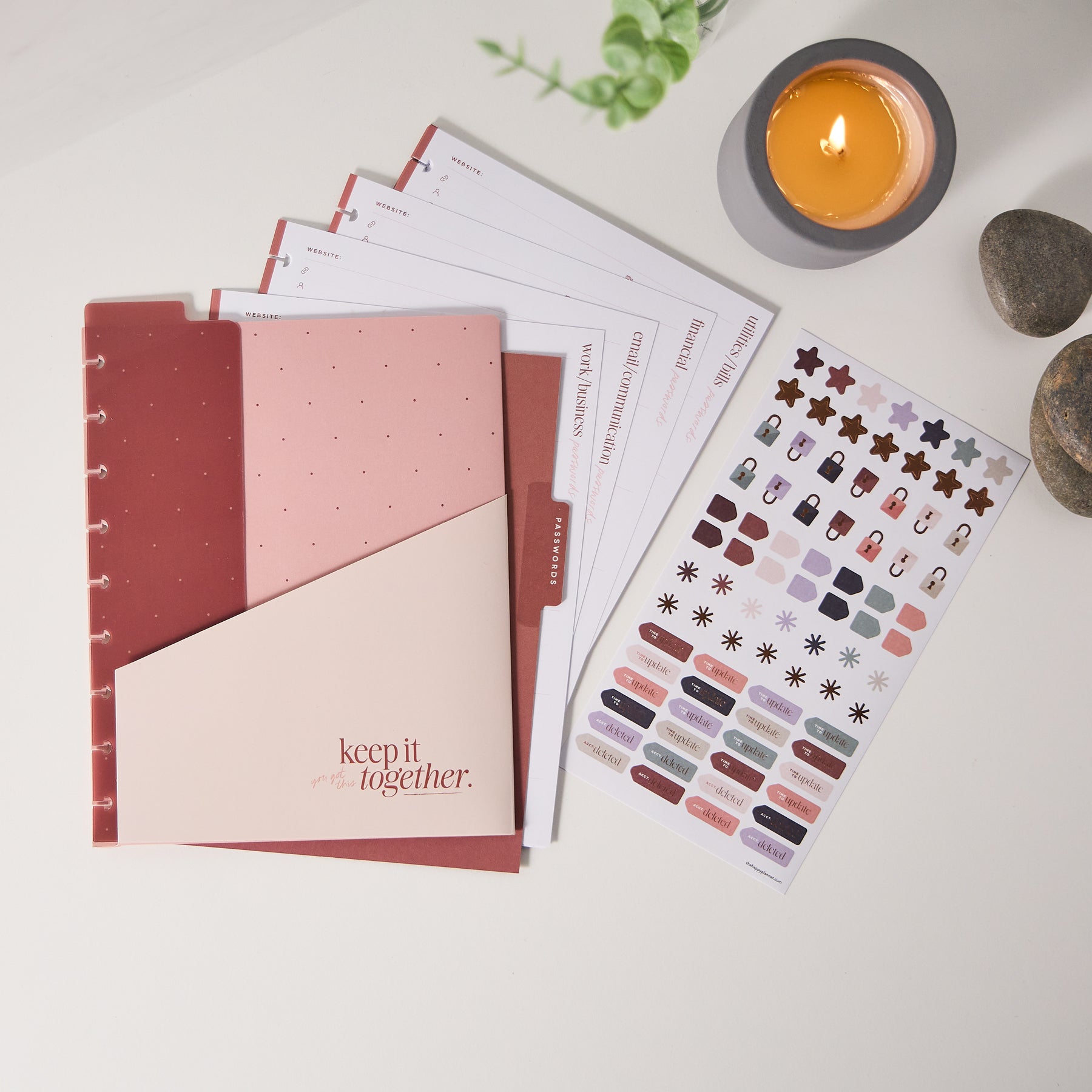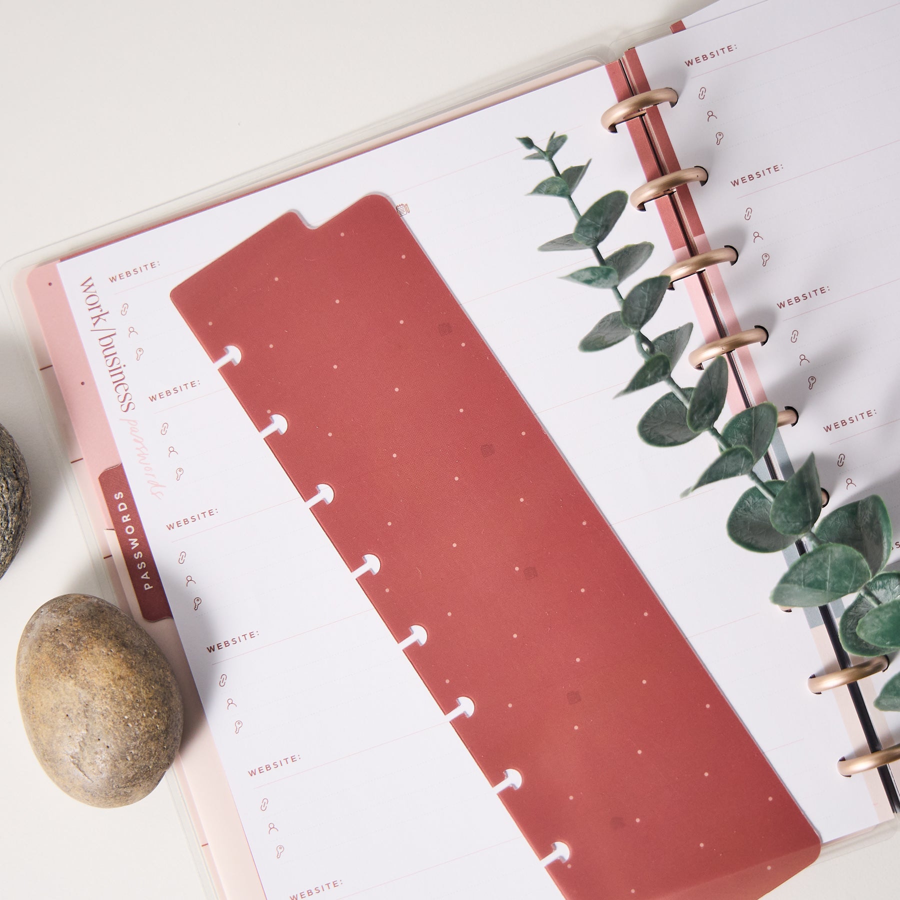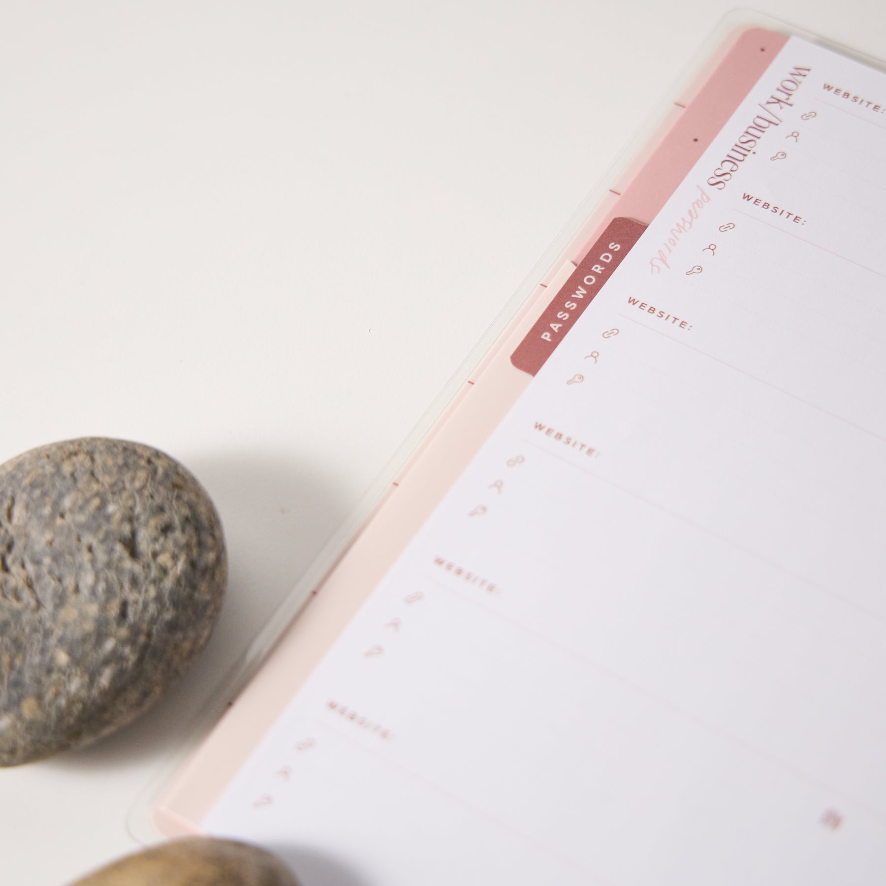 Never forget a login again with the Rise & Align Passwords Classic Accessory Pack. This pack includes dedicated pages and dividers to help you keep track of website logins, accounts, and other important details all in one convenient place.