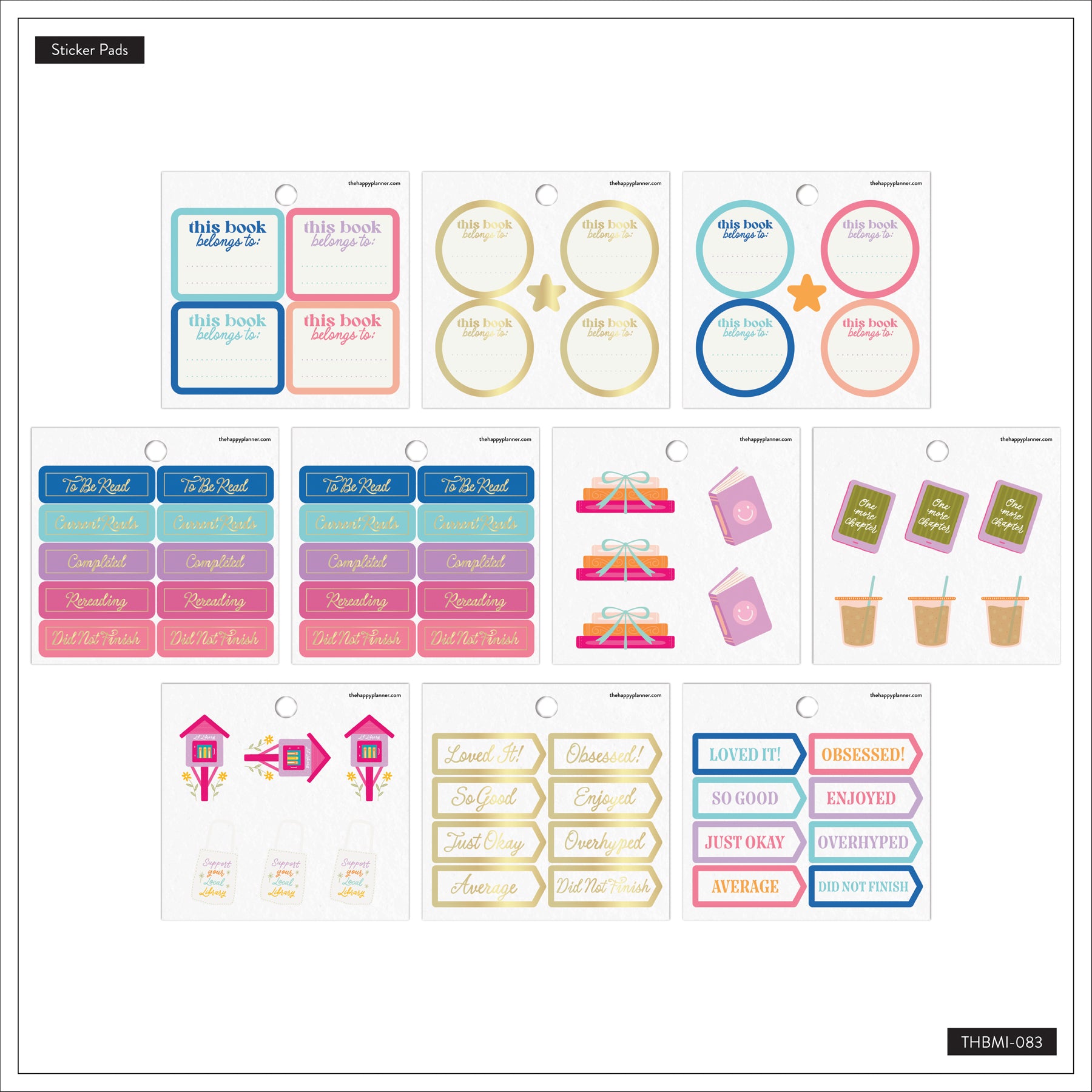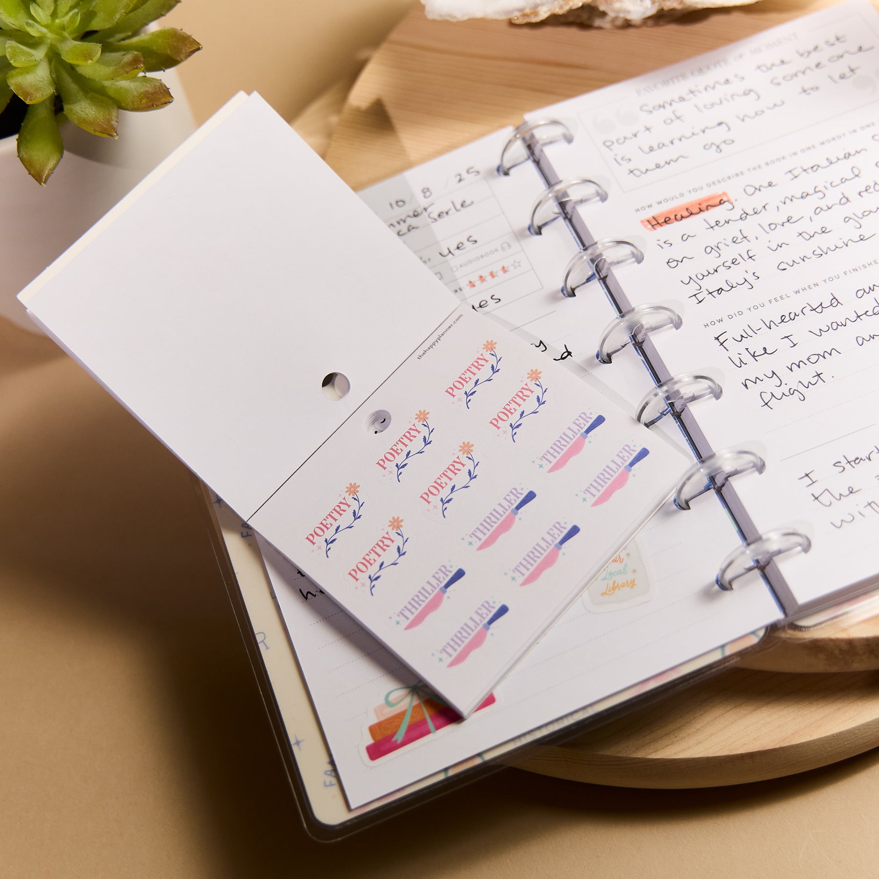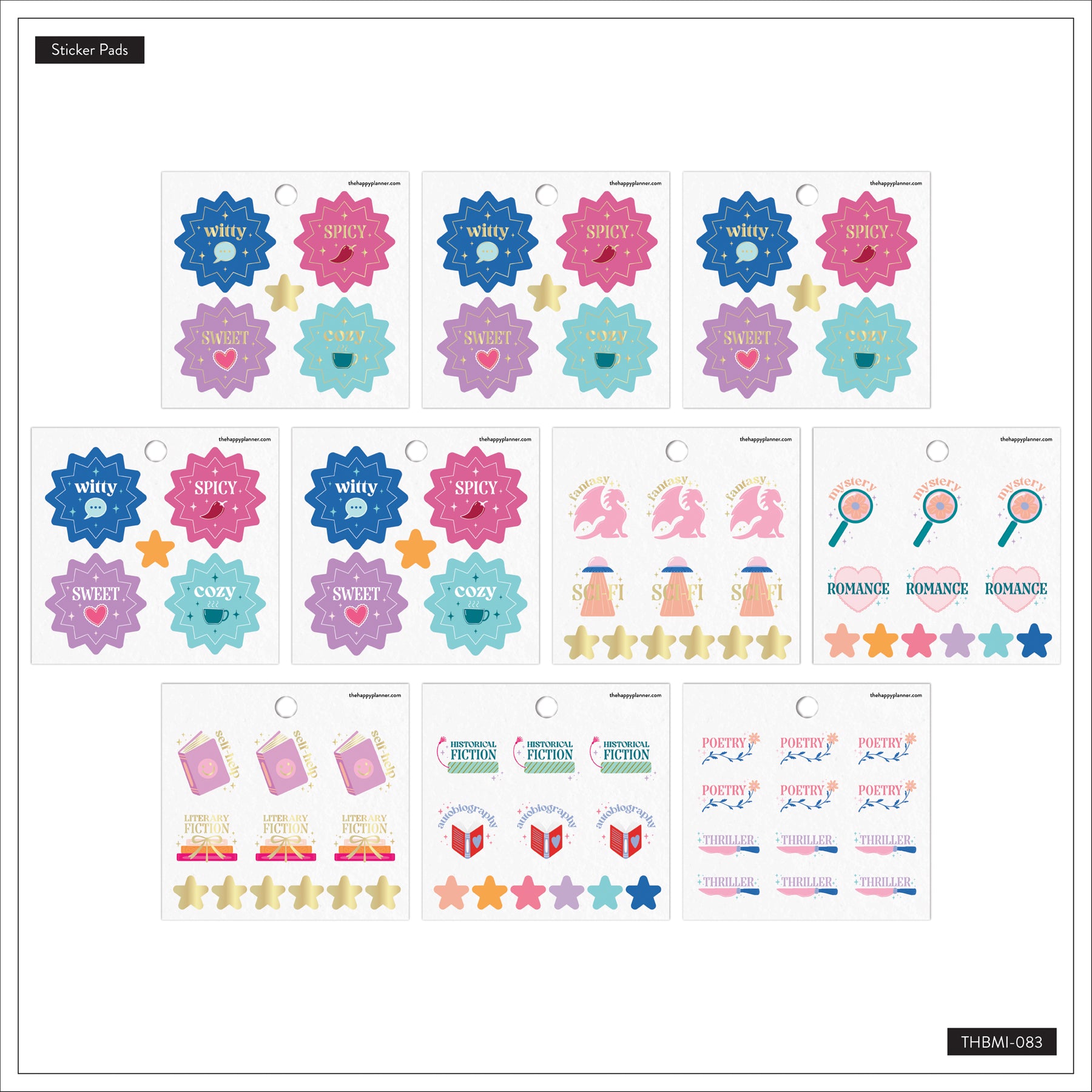 • 20-sheet tiny sticker pad with witty and bookish designs for decorating or journaling