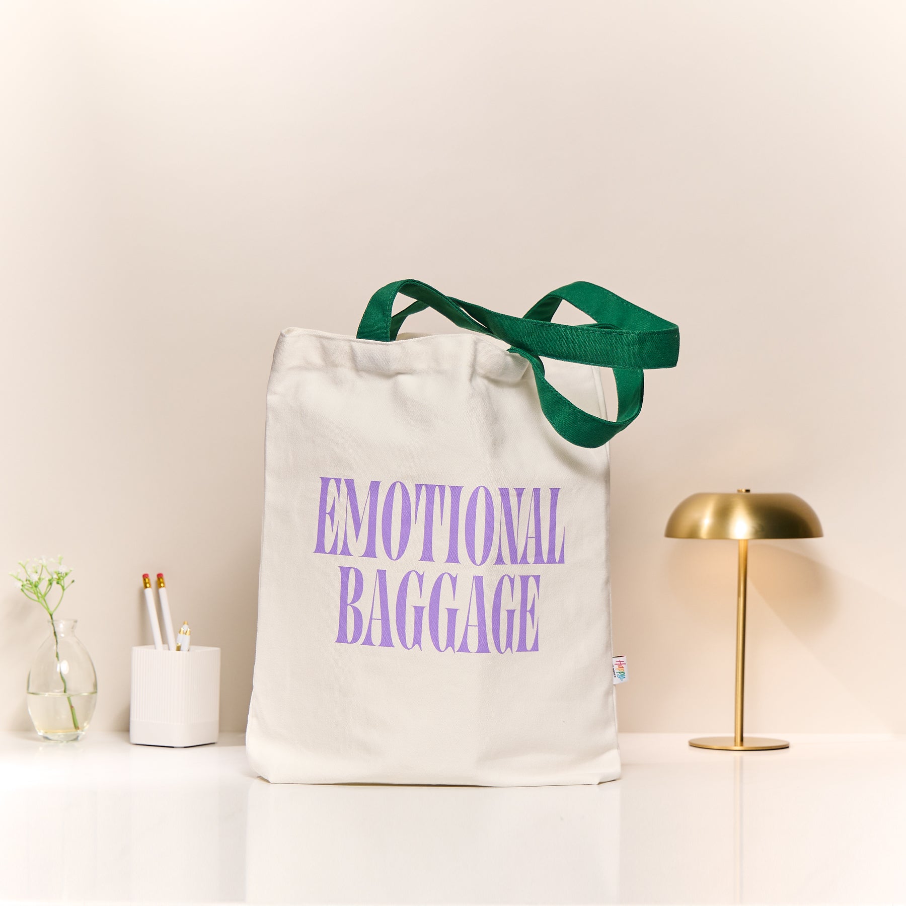 • 1 sturdy canvas tote bag with bold printed design: Emotional Baggage