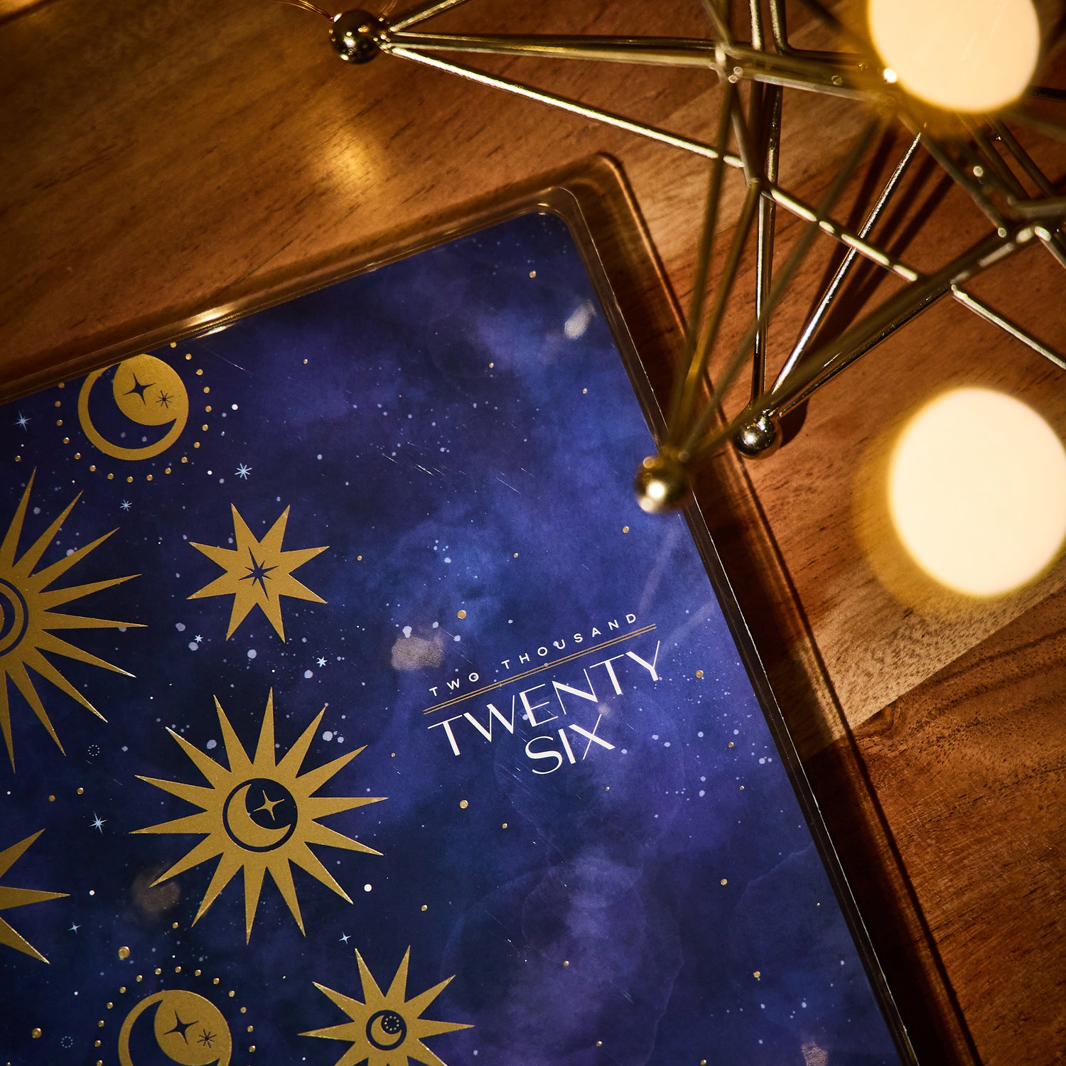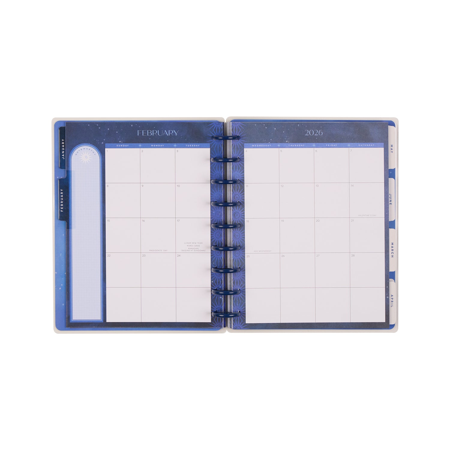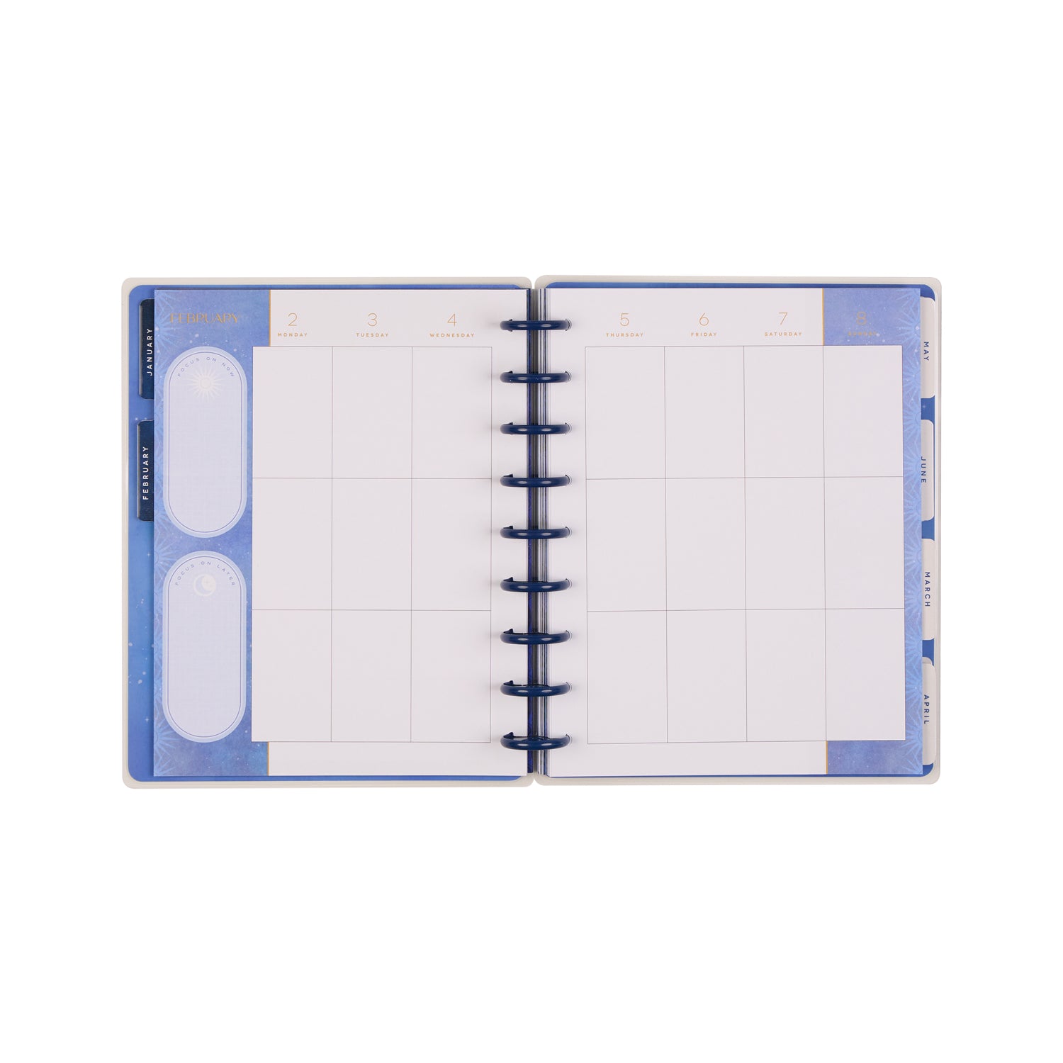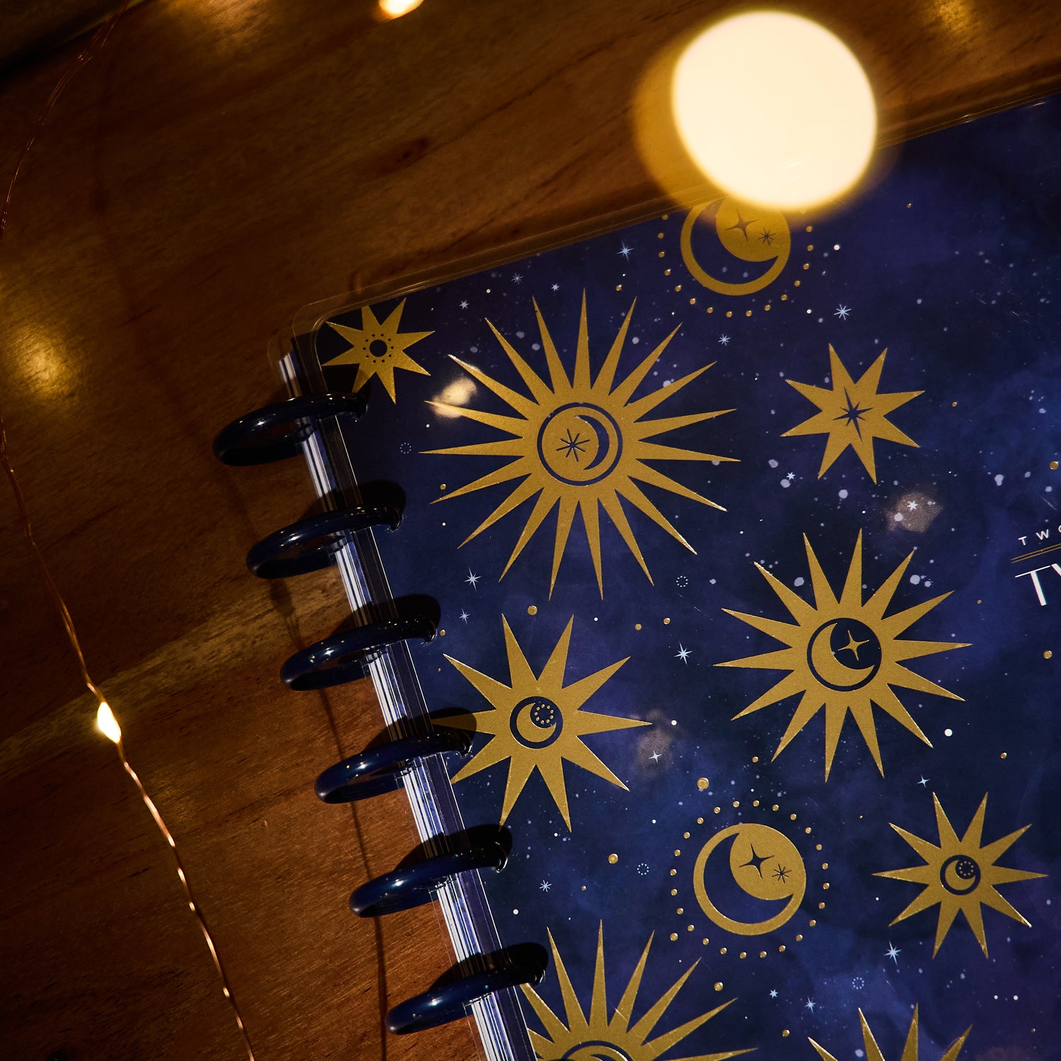 Get ready to plan by the stars. This 12-month planner features a magical celestial cover, deep navy tones, and golden sun and moon accents. Inside, each monthly divider showcases a different astrological sign, making it the ultimate planner for zodiac lovers and cosmic dreamers alike.