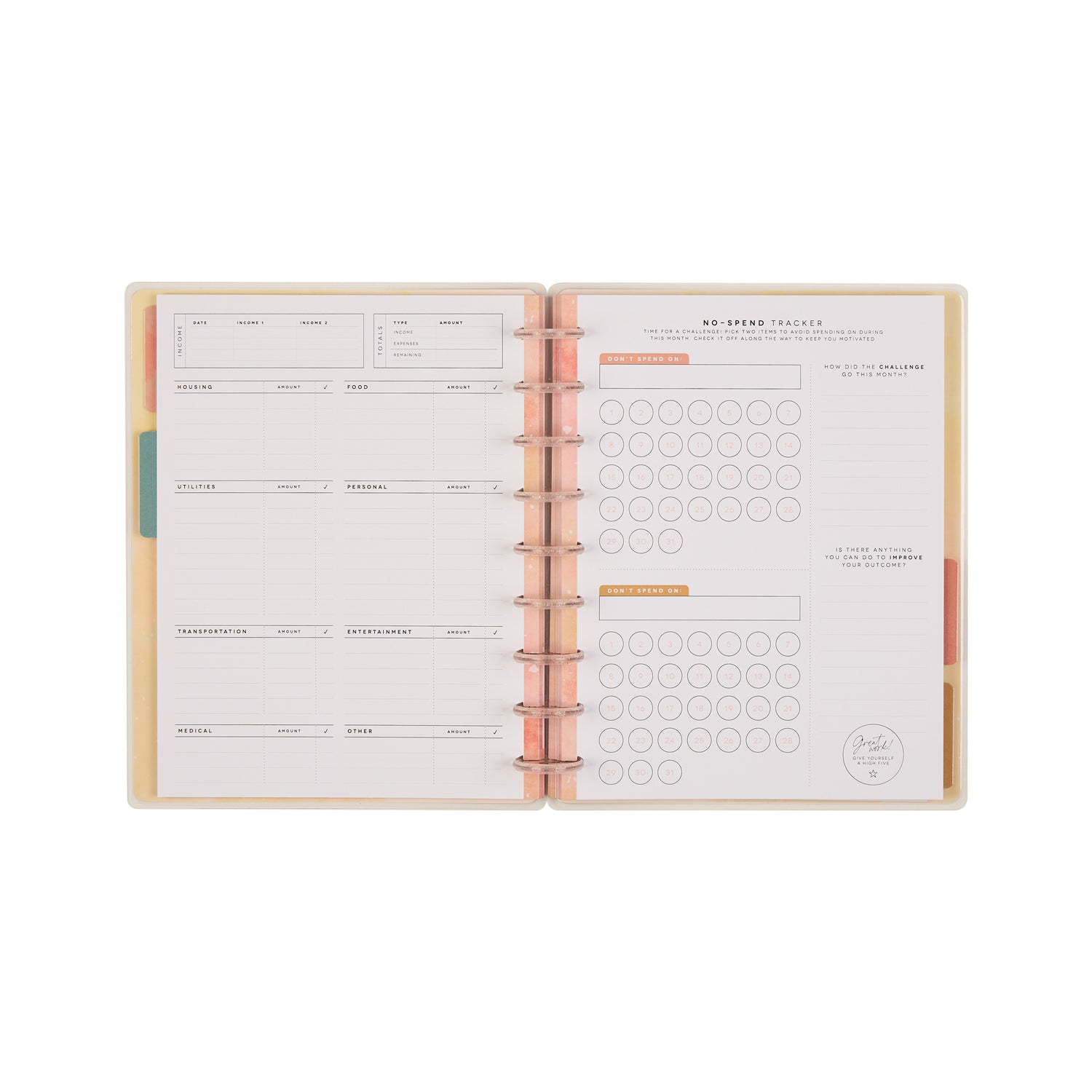 • Includes 40 guided sheets to track expenses, savings, monthly bills, and budget goals