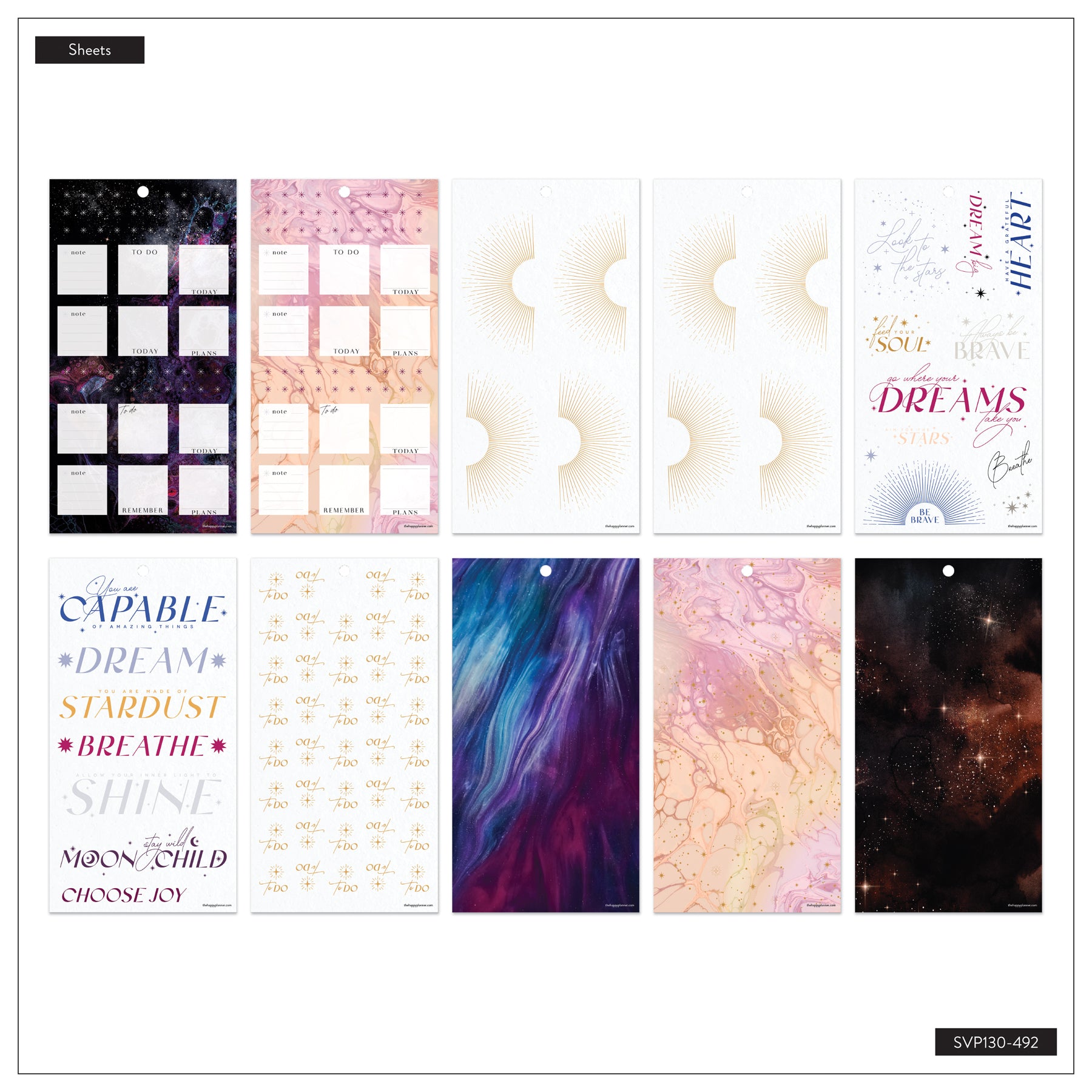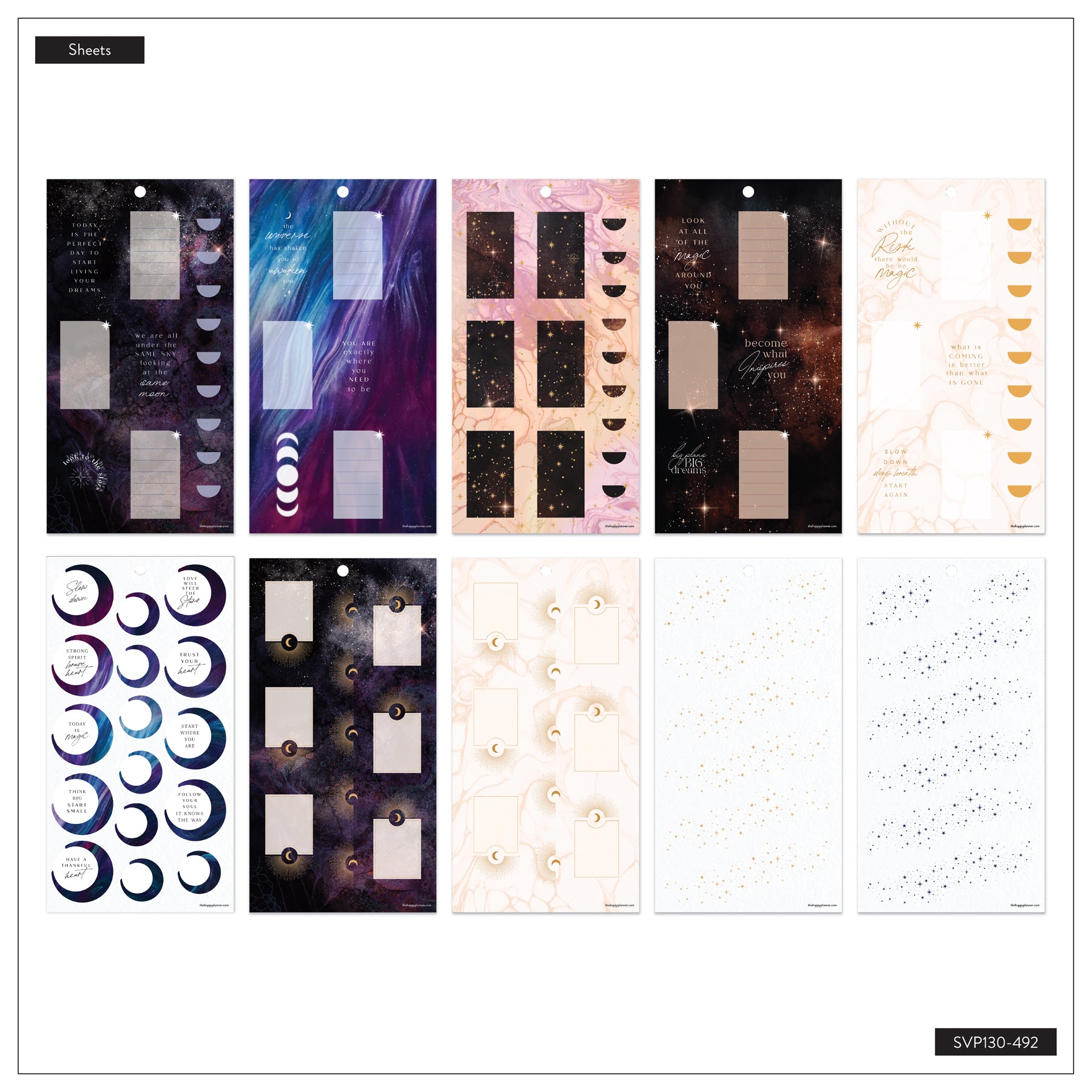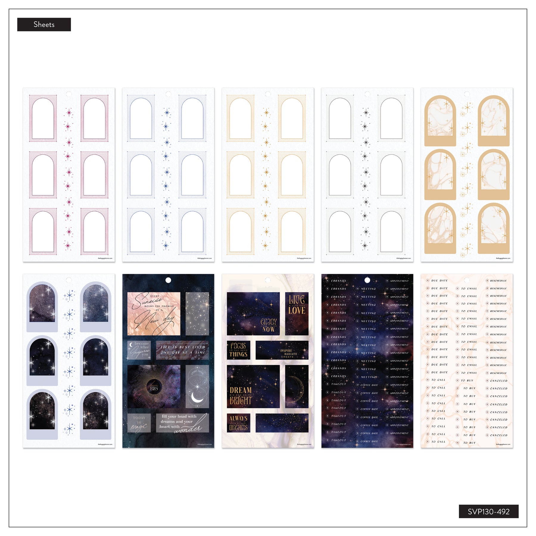 Bring a little celestial magic to your planning with the Stargaze Shimmer Value Pack Stickers. Designed with dreamy night-sky artwork, cosmic symbols, and soft shimmering accents, this collection adds an enchanting touch to any planner spread. Each sheet features a blend of functional boxes, decorative arches, moon phases, and metallic-inspired elements that feel both mystical and elegant.