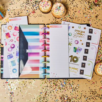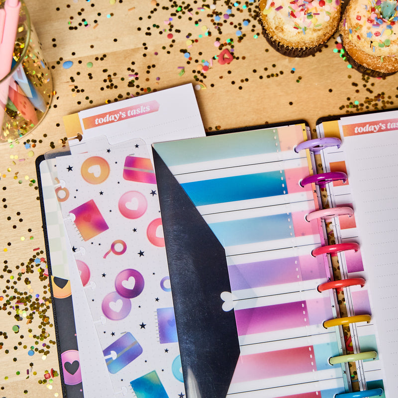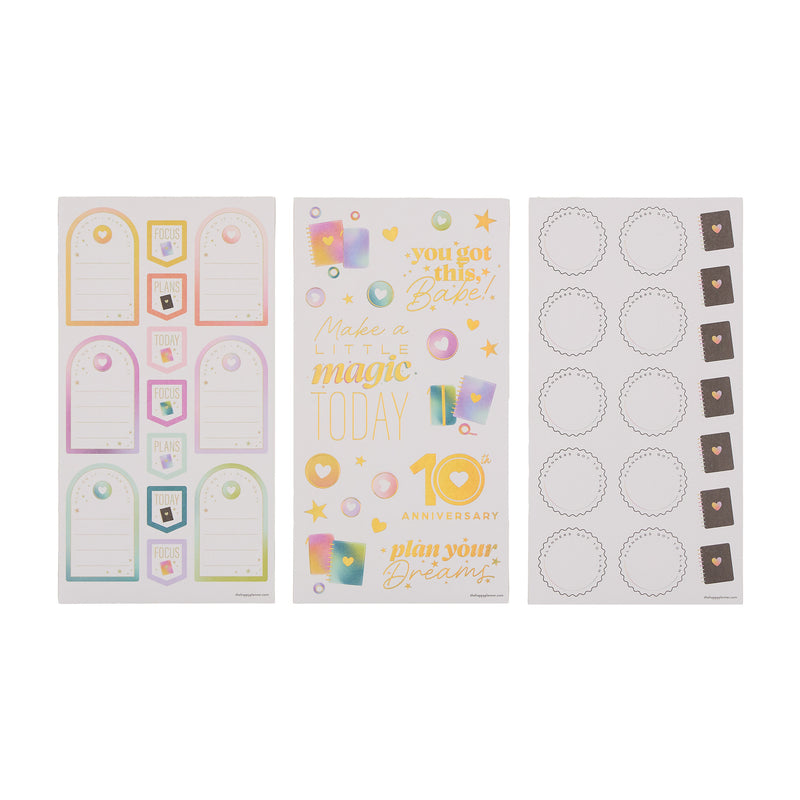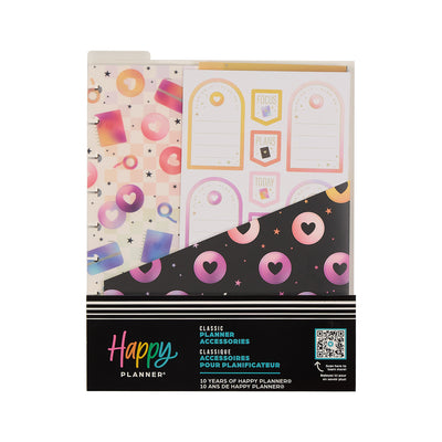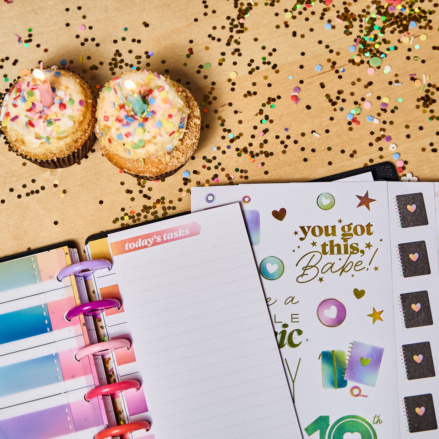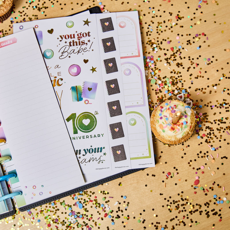 Celebrate a decade of planning with this vibrant 10 Years of Happy Accessory Pack. Designed to match our signature style, this pack features coordinating accessories in a colorful celebration of our iconic heart discs—complete with stars, gradients, and nostalgic charm. It’s the perfect add-on for customizing your Classic Happy Planner.