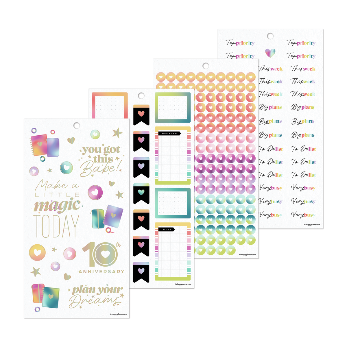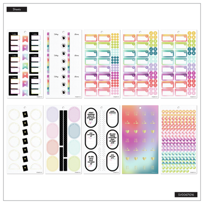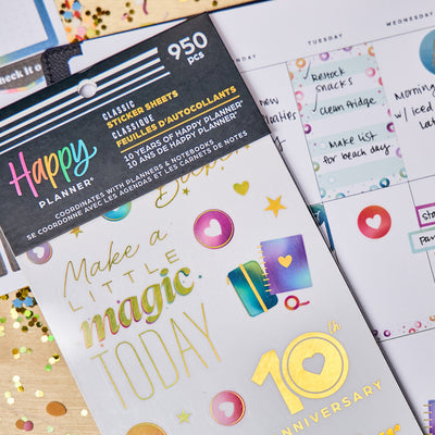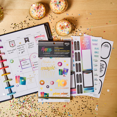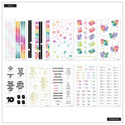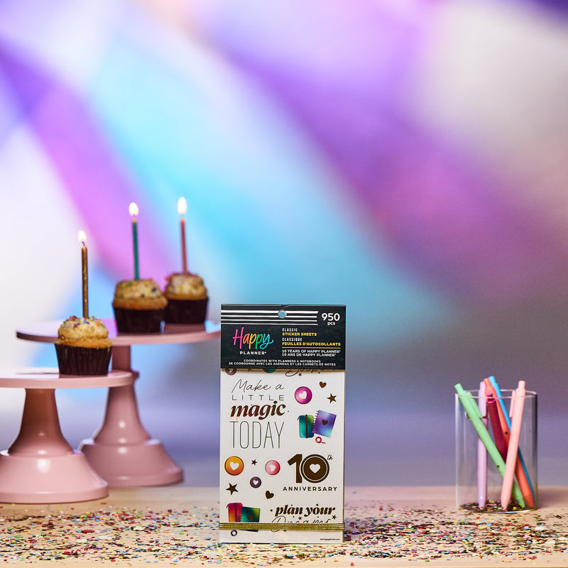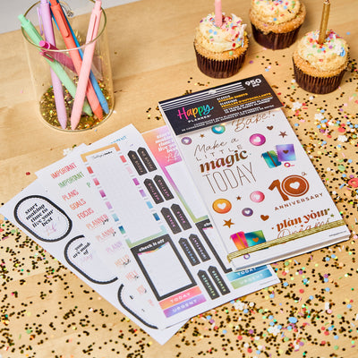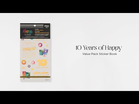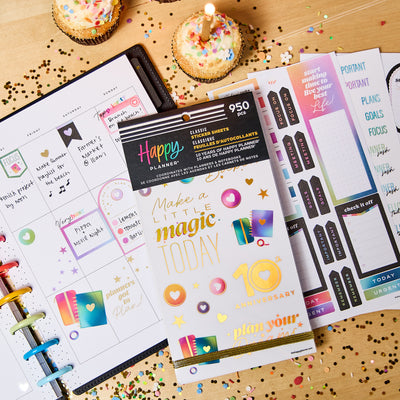Celebrate a decade of planning joy with the 10 Years of Happy Value Pack Sticker Book. This special edition sticker book features 950 stickers across 30 sheets—filled with uplifting quotes, functional labels, decorative icons, and holographic accents inspired by our original rainbow palette. You’ll spot our signature heart discs throughout, a nod to the journey that started it all.