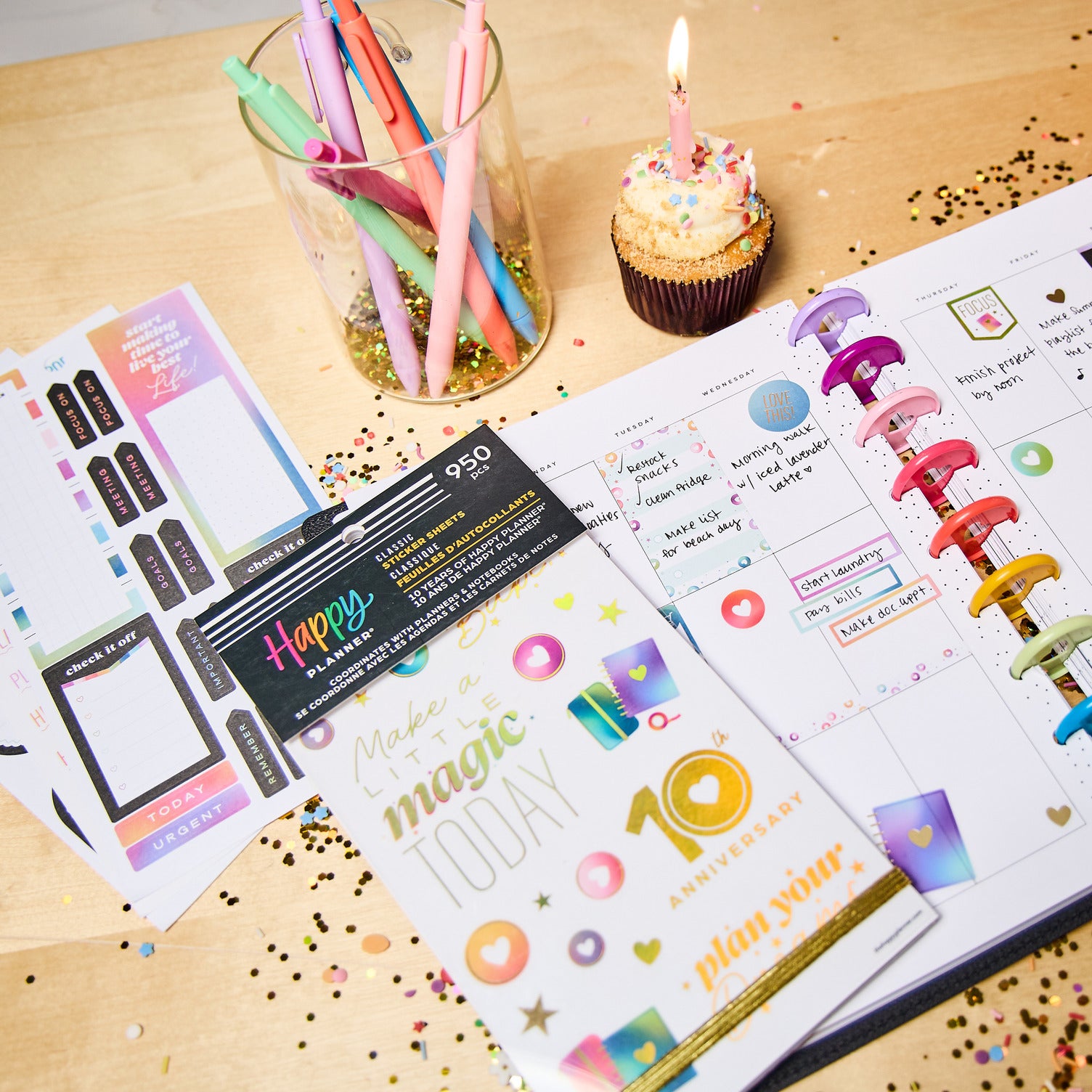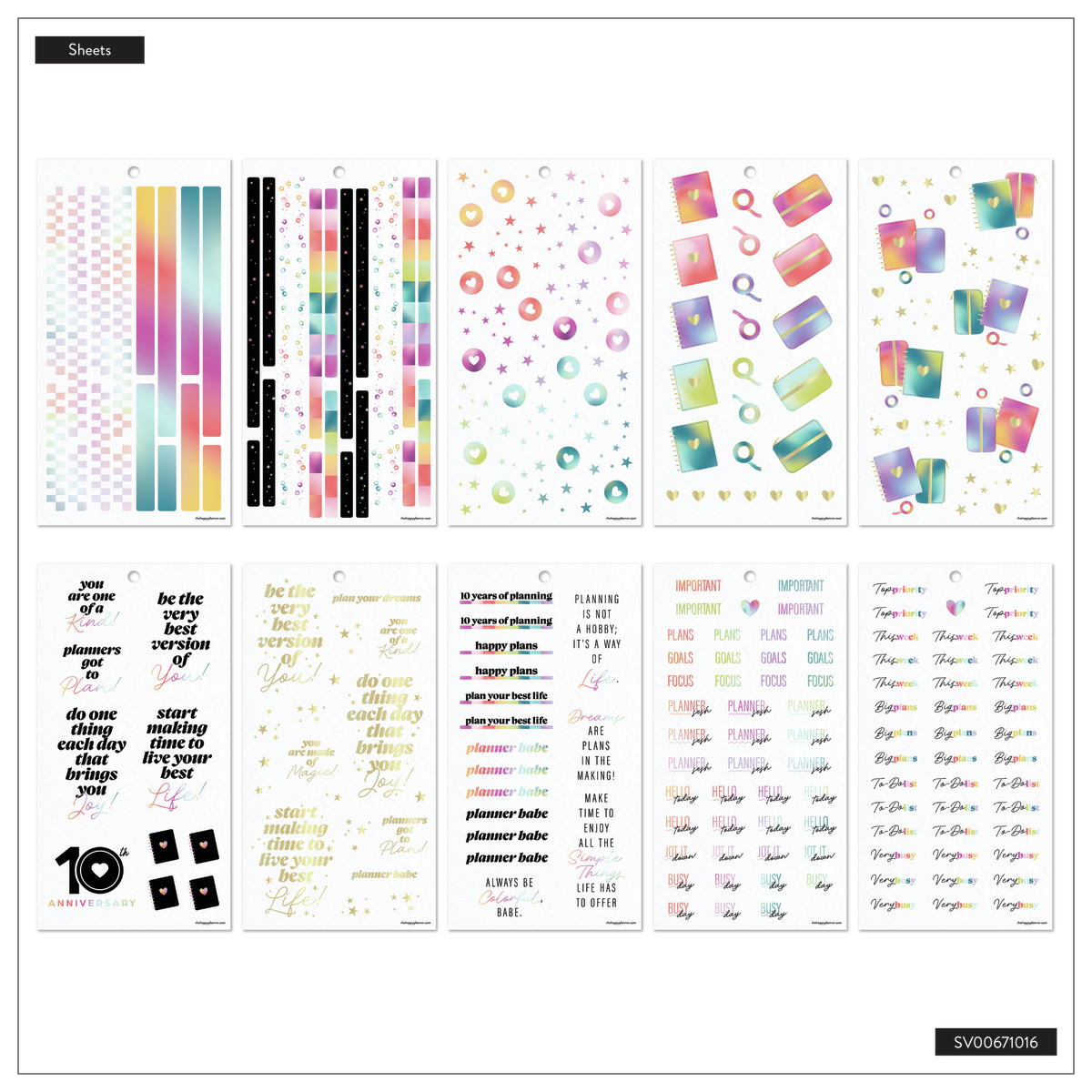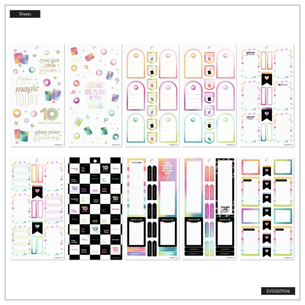 Celebrate a decade of planning joy with the 10 Years of Happy Value Pack Sticker Book. This special edition sticker book features 950 stickers across 30 sheets—filled with uplifting quotes, functional labels, decorative icons, and holographic accents inspired by our original rainbow palette. You’ll spot our signature heart discs throughout, a nod to the journey that started it all.