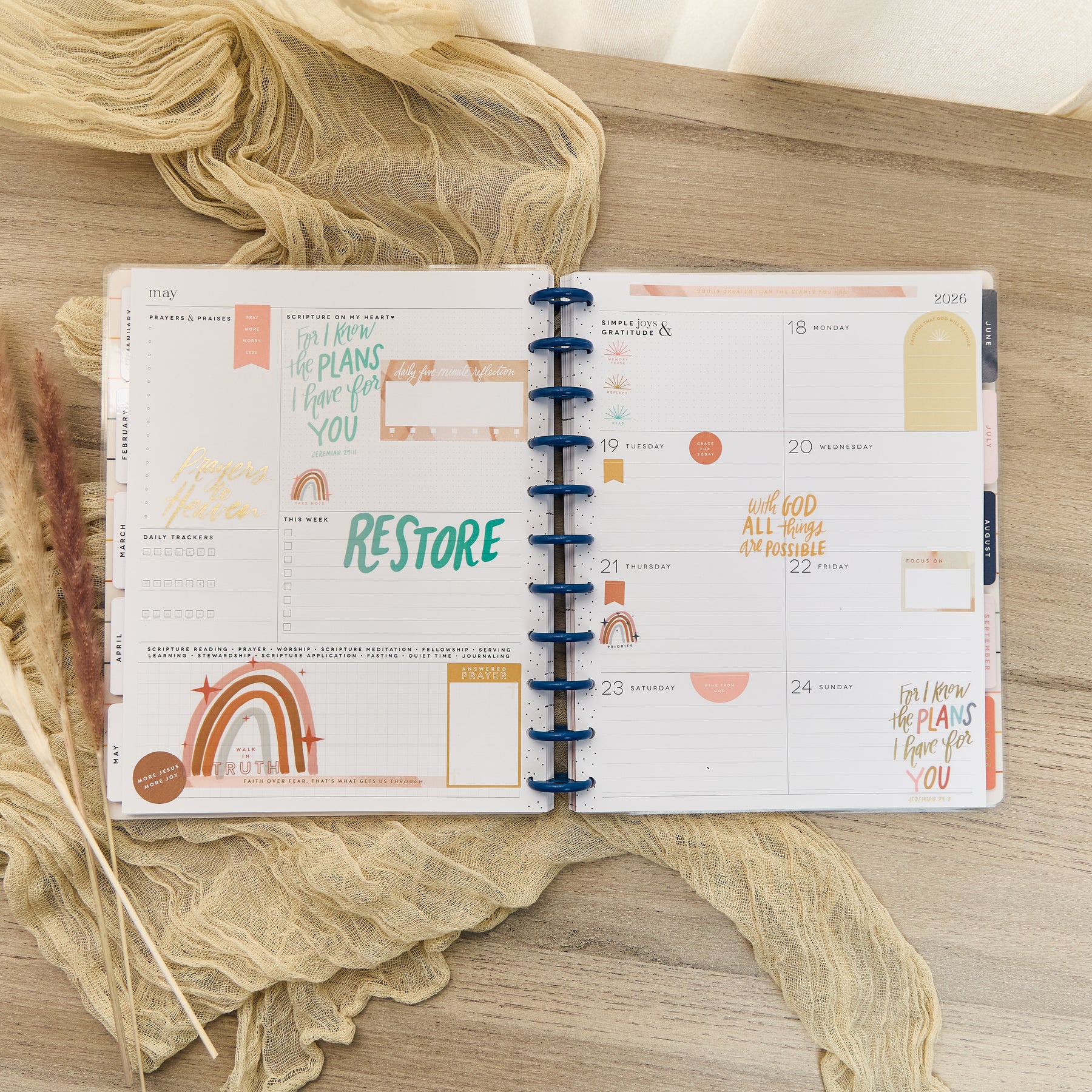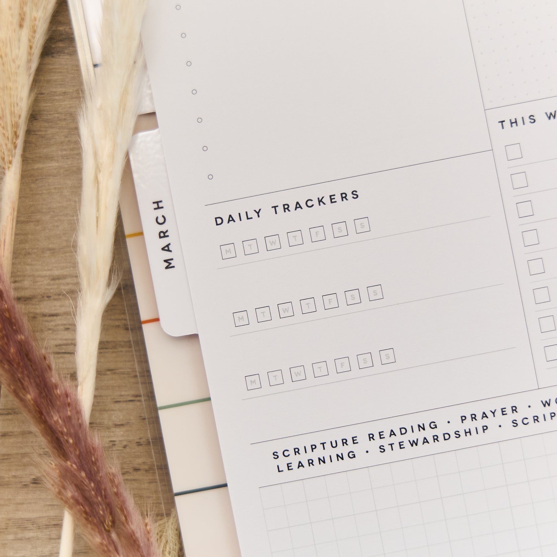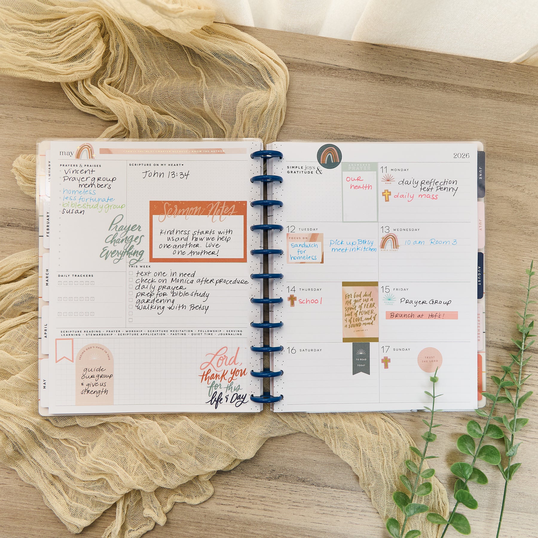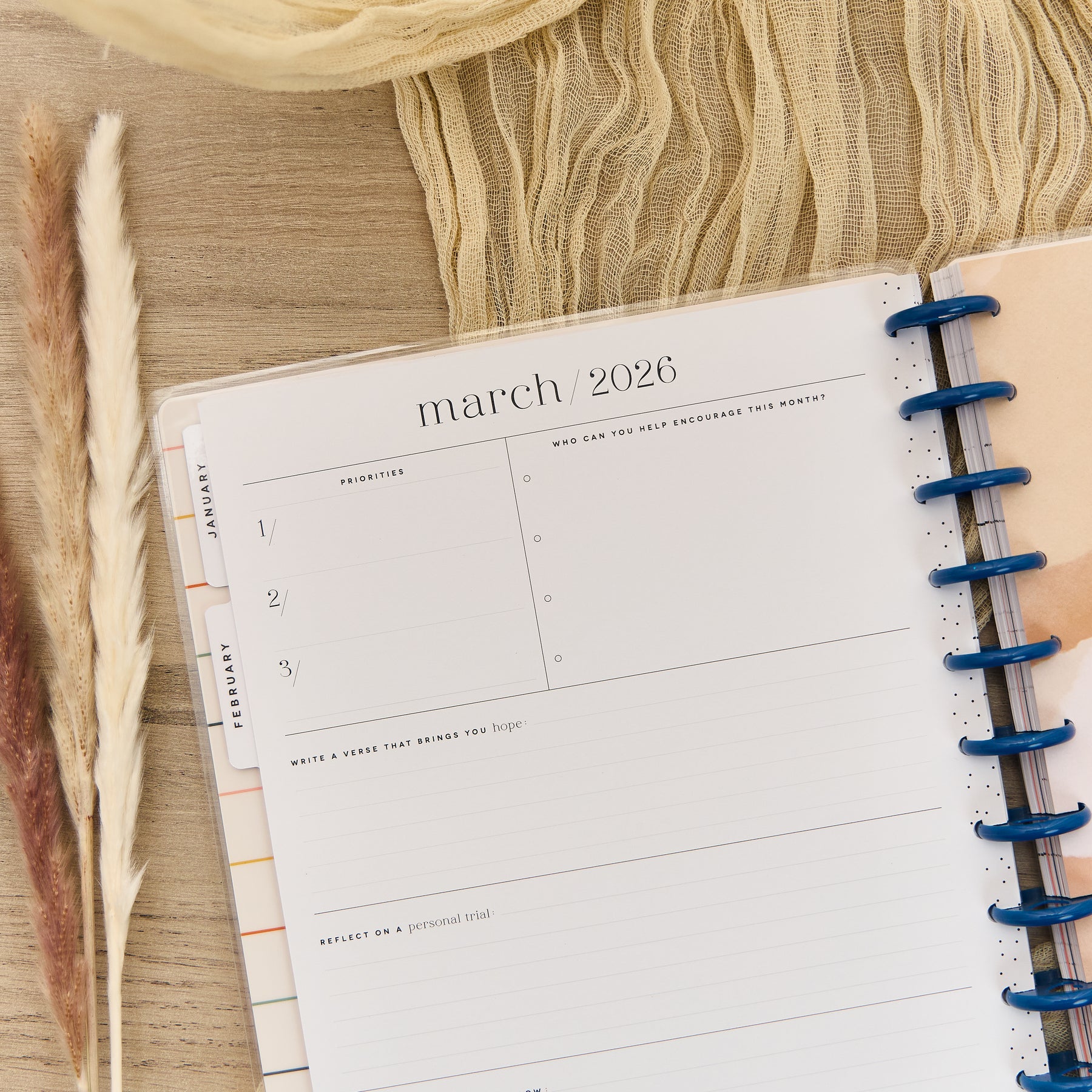 • Includes monthly calendars, weekly devotional layouts, divider tabs, and uplifting faith quotes