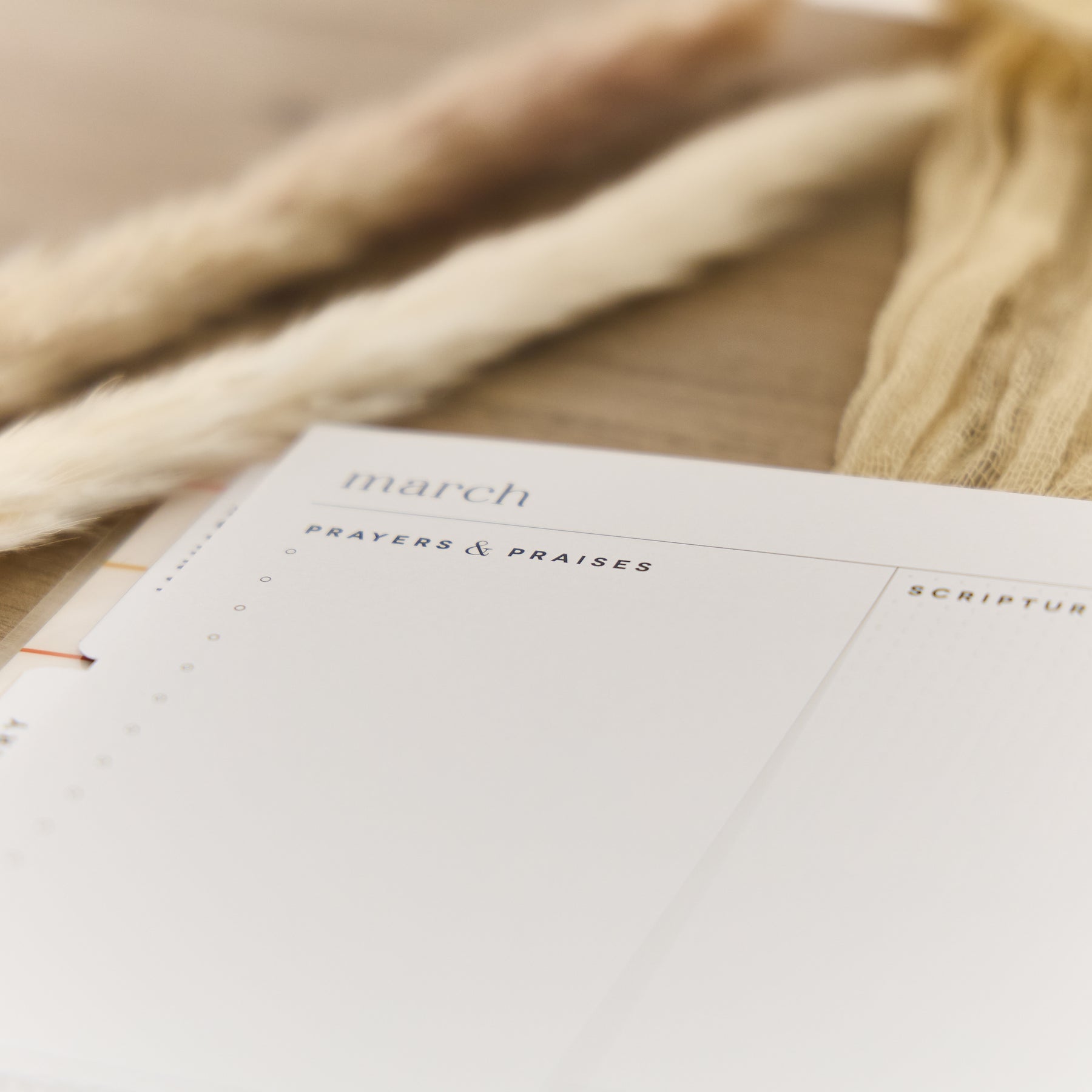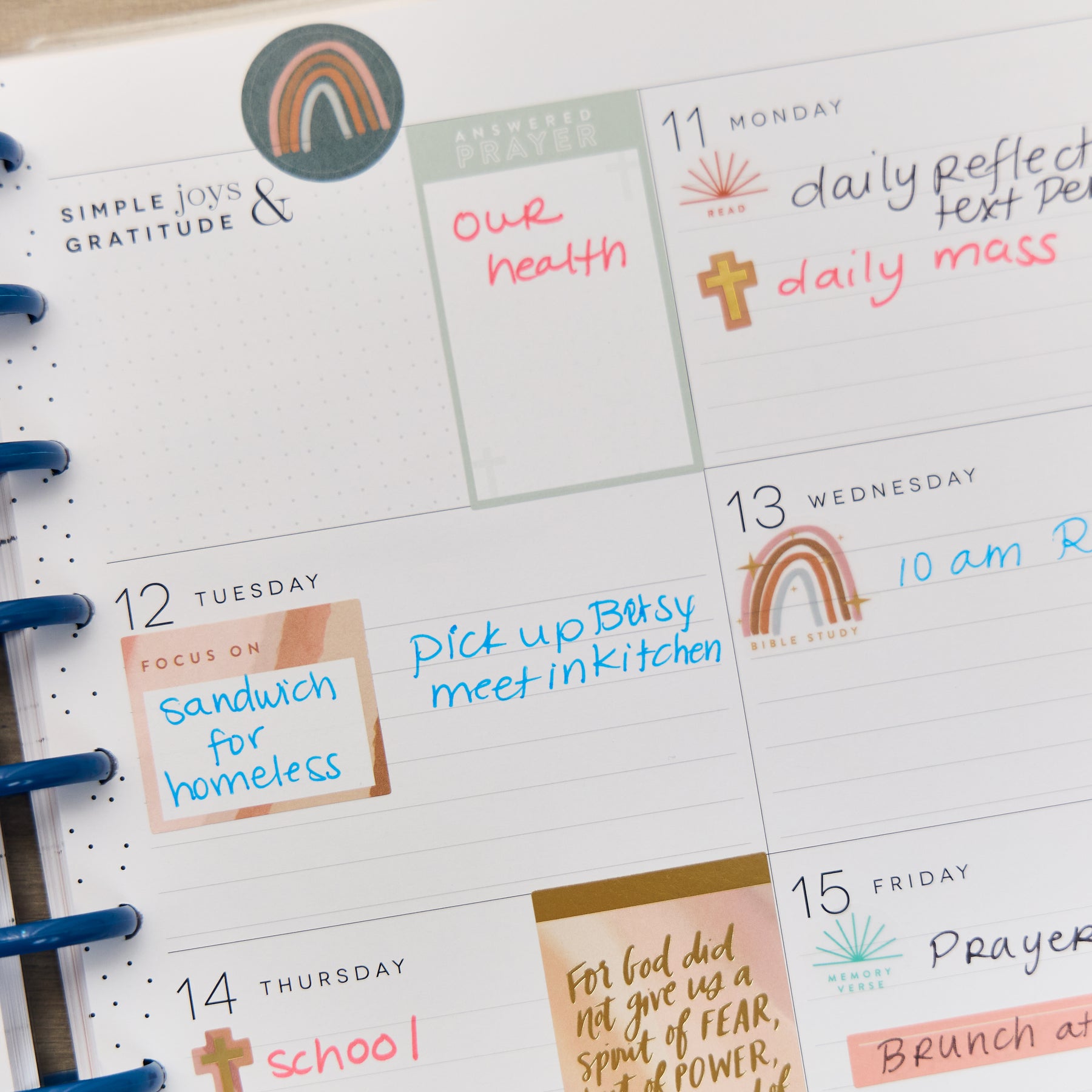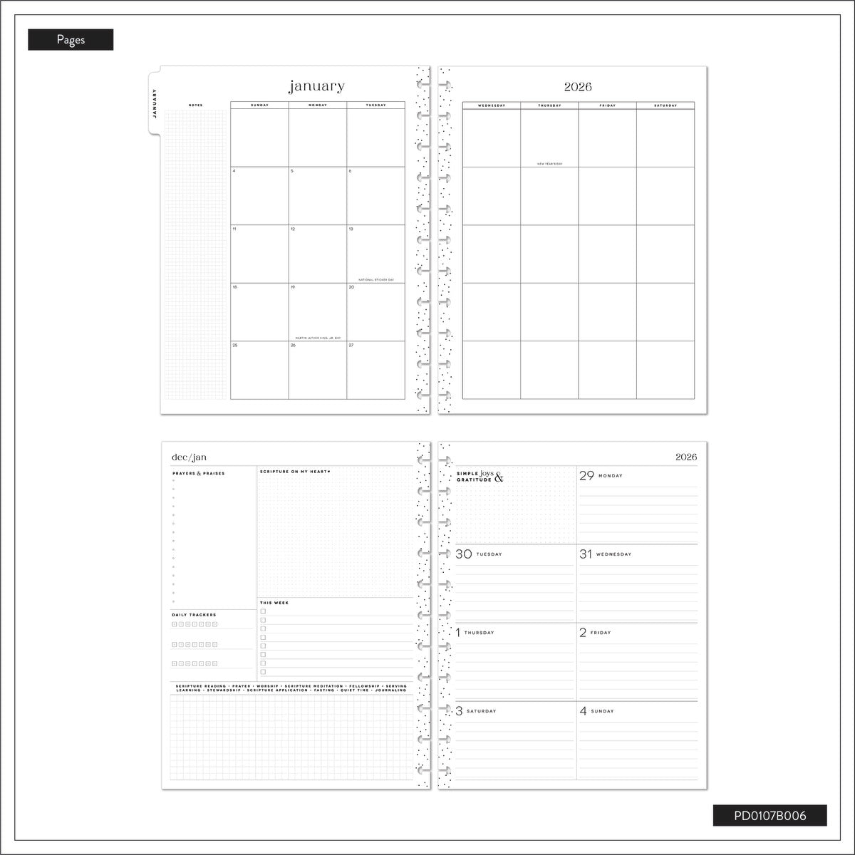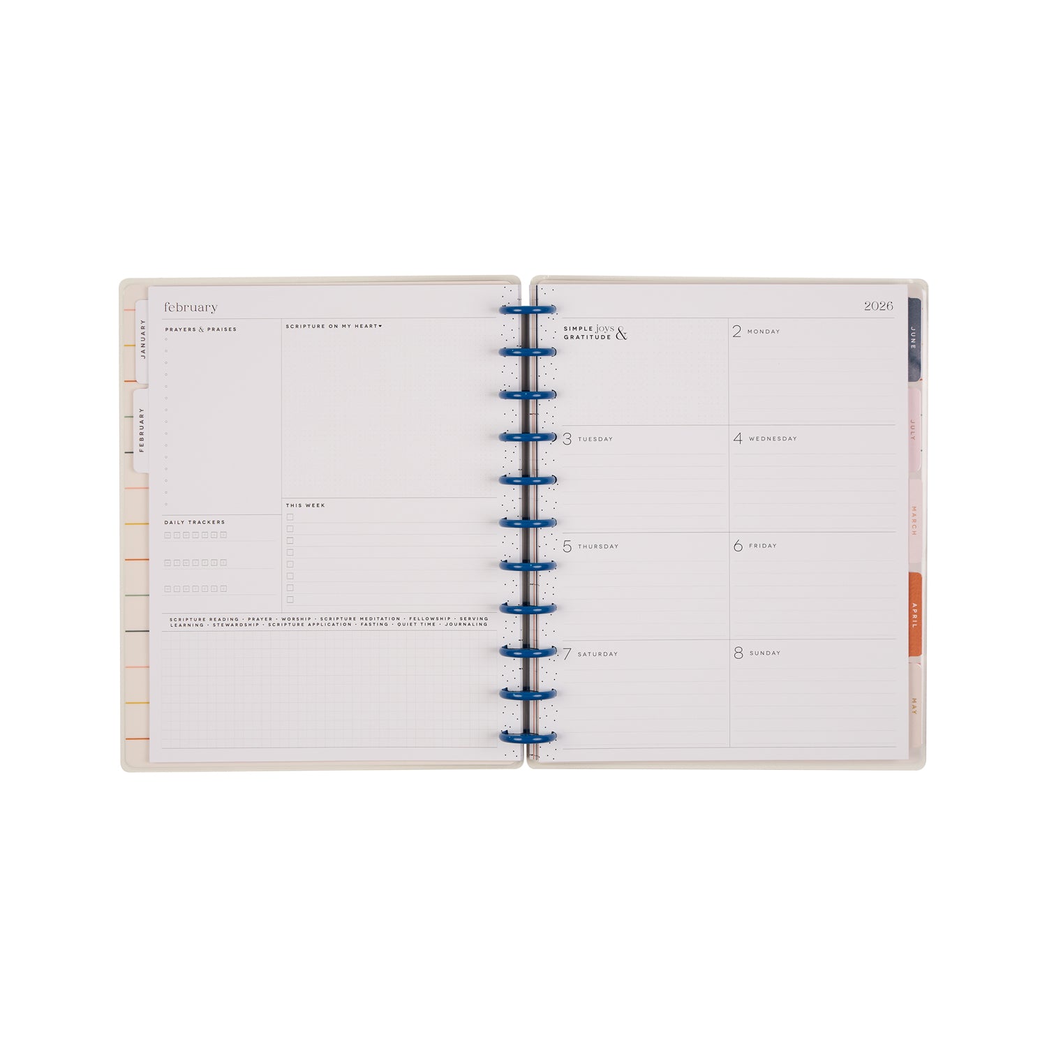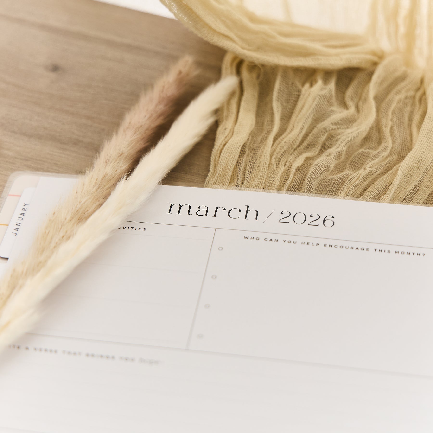 • Includes monthly calendars, weekly devotional layouts, divider tabs, and uplifting faith quotes