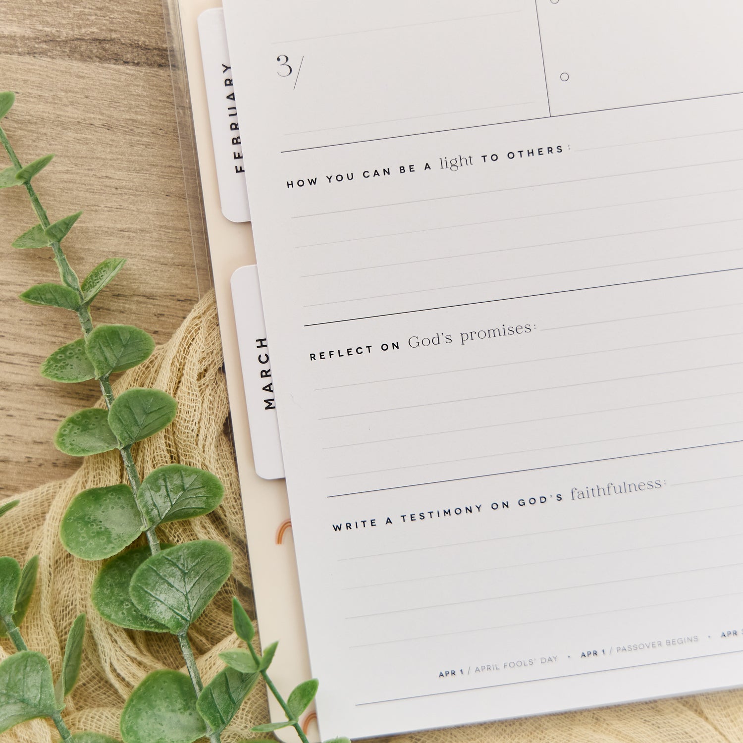 • Includes monthly calendars, weekly devotion pages, divider tabs, and inspirational faith quotes
