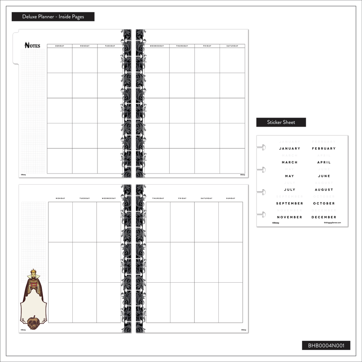 • Deluxe Undated Vertical Classic Planner – A 12-month vertical layout wrapped in a rich, textured vegan leather cover—finished with striking gold villain icons and bold dividers worthy of any master plan.